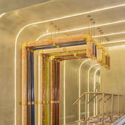 Con capacidad para 26 comensales, el acceso te recibe con muros que dan la apariencia de ser un helado derritiéndose. Al centro se ubican unos tubos acrílicos con dulces encapsulados, que suben desde el piso por el muro y el plafón, y terminan sobre la barra monolítica que guarda los toppings; destacando su importancia a través del dinamismo y la diversión. La presencia de la marca se integró de manera sutil en todo el espacio, desde los elementos decorativos hasta las cajas de empaque.